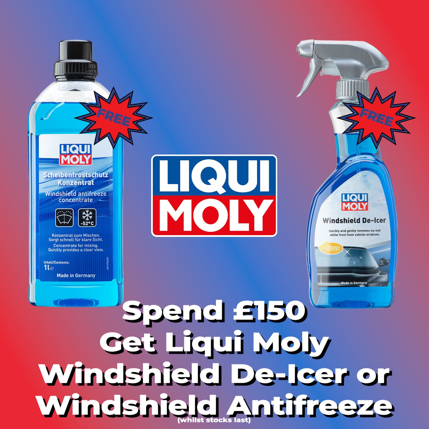 When you spend over £150 in a single order, get for free; 1 x Liqui Moly Windshield Antifreeze Concentrate OR 1 x Liqui Moly Windshield De-Icer