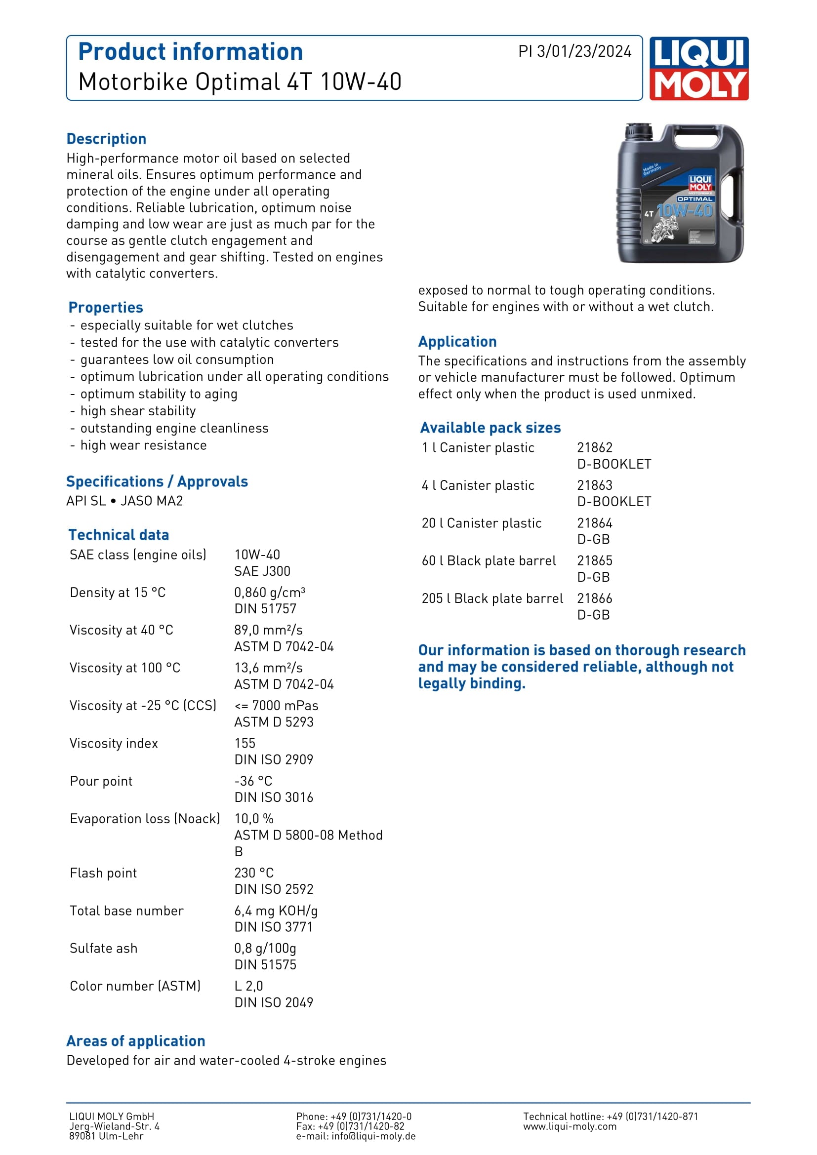Liqui Moly 21862 4T 10W-40 Optimal Motorbike Engine Oil - 1 Litre